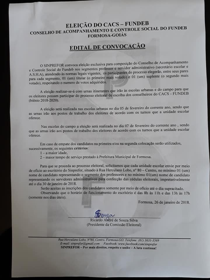 A documentação do processo eleitoral foi entregue, para cada gestor das unidades escolares da rede municipal de Formosa, com o objetivo da informação chegar até o conhecimento dos servidores e servidoras, mobilizando a categoria em participar do processo da escolha dos conselheiros destes segmentos.