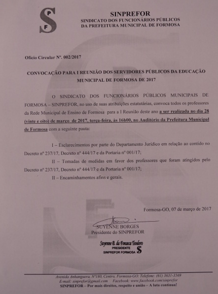 SERVIDORES PÚBLICOS DA EDUCAÇÃO DE FORMOSA SÃO CONVOCADOS PARA A 1ª REUNIÃO COM O SINPREFOR