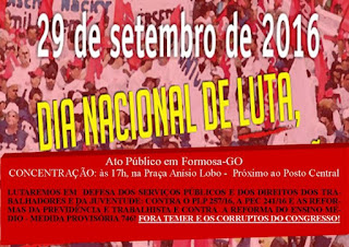 Segundo a chamada para o ato: “Nesta quinta-feira, iremos às ruas de Formosa denunciar os ataques à educação, aos direitos dos trabalhadores, das trabalhadoras e da juventude ao povo de Formosa. Chamar a população para lutar contra a PEC 241, que caso seja aprovada irá congelar investimentos em áreas sociais por 20 anos. Poderá inclusive congelar os nossos salários por igual período” convoca a página do evento.